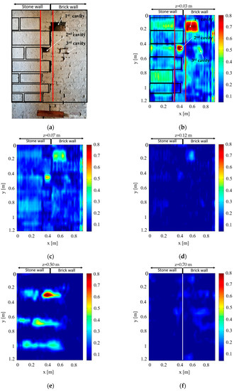 On the other hand, the tomographic images, for depths greater than z = 0.20 m, allowed us to retrieve information concerning the global thickness of the brick wall and the internal arrangement of the stone walls. Specifically, based on the depth slices from z = 0.45 m to z = 0.64 m, three stone blocks, which are 0.70 m long and whose arrangement is similar to that of the surface stones (see Figure 5e), appear. Therefore, both the brick and stone parts of the wall appear to be layered structures, which are combined with each other by means of a joint structure like a zip. Furthermore, by taking into account the depth slices from z = 0.65 m to z = 0.71 m, it is possible to recognize the interface between the stone and the brick parts of wall, by observing that the stone part appears as a homogeneous medium, while the brick part is quite non-homogeneous (see Figure 5f). Finally, the depth slices at z greater than 0.72 m show the other side of the brick wall, i.e., the brick wall-air interface.