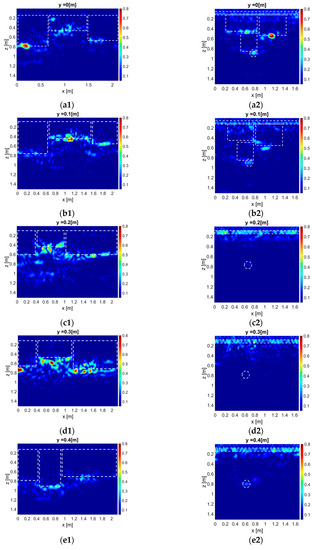 The sequence of the tomographic images at increasing constant depths obtained by exploiting both the BG removal and TG procedures are shown in the Supplementary materials, in Figure S1. In this file, the depth slices from z = 0.01 m and z = 0.20 m were obtained by using BG removal, while the other one was obtained using the TG procedure. The results in Figure 5b–e have been extracted by the content of the multimedia file Figure S1.