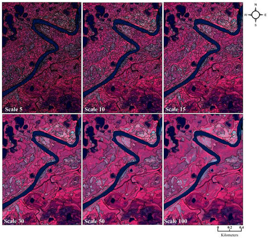 Segmentation scale affects the object size and hence the properties of discrete objects in the study area. We analyzed multiple scales in turn (e.g., 5–100; Figure 4) and determined via accuracy assessment that segmentation at the spatial scale of 5 provided the optimum image-object size. Color (multispectral heterogeneity) and shape (a function of smoothness and compactness heterogeneity) are the primary image-object features that are used for image-segmentation and for improvement in primitive image-object creation [30]. We segmented color (i.e., spectral band information) and shape (compactness and smoothness metrics) to generate optimum pixel groups (i.e., image-objects) exhibiting intra- and inter-object spectral homogeneity and heterogeneity [60]. Initial analyses of the study area informed our decision to use shape and color segmentation weights of 0.1 and 0.9, and compactness and smoothness parameters of 0.5, respectively. Upon segmentation completion, we calculated the spatial and spectral metric average values for each of the 5,191,948 segmented objects in the study area. We then utilized the RF approach described above to classify the study area. Similar to the pixel-based ML approach, OBIA-RF was performed using three- and five-stack layers to provide the opportunity to contrast amongst the methods in wetland classification.