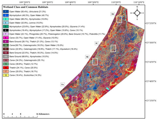 (a) Genus-level wetland and aquatic habitats classification map (pixel-based RF approach using three-layer stack). Four focal areas (5A–5D) are shown in finer detail in (b). Percent values given in parentheses represent the approximate abundance of each genus or habitat found in the field-based analyses for each class. (b) Finer-detailed genus-level wetland and aquatic habitat classification thematic maps developed using the pixel-based RF approach for the areas of interest shown by white-colored squares in (a). Classes correspond to the legend in (a).