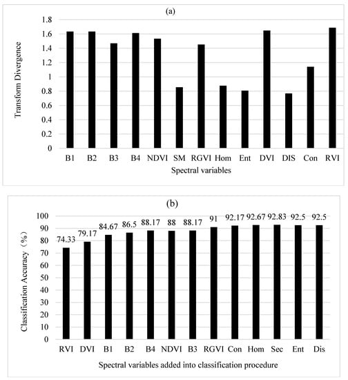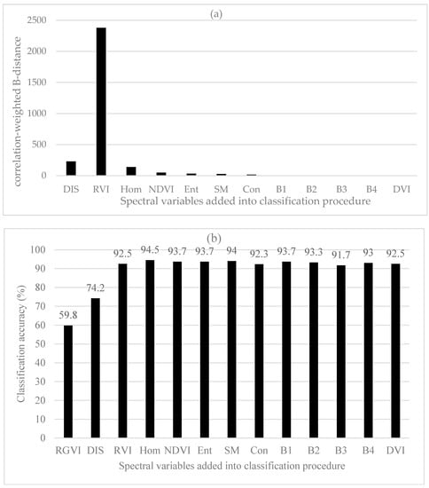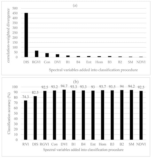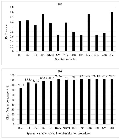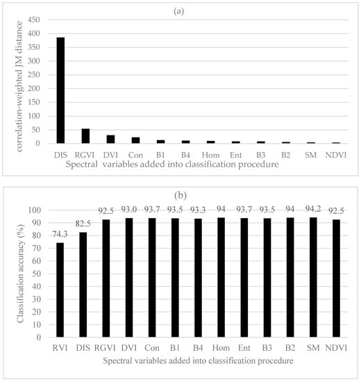 Figure 3a showed the importance rank of the left 12 spectral variables after the first spectral variable RVI and their correlation-weighted JM distances. When the first spectral variable RVI was added, no correlation needed to be considered and its selection was determined based on the original JM distance above. Starting from the second spectral variable added, the correlation-weighted JM distances of all the left spectral variables related to the first added spectral variable were calculated and the spectral variable that had the greatest distance was chosen. After the second spectral variable was added, the correlation-weighted JM distances of all the left spectral variables related to the first and second added spectral variables were calculated and the third spectral variable was identified and added based on the largest correlation-weighted JM distance. This process continued until all the spectral variables were ranked. The obtained importance rank of the spectral variables shown along the x-axis of Figure 3a differed from that based on the original JM distances. After RVI was added, among the left 12 spectral variables, texture measure Dis had the greatest correlation-weighted JM distance and was chosen as the second spectral variable added into the classification procedure. After that, the rank of the selected spectral variables was RGVI, DVI, Con, B1, B4, Hom, Ent, B3, B2, SM and NDVI, which were orderly added (Figure 3a).