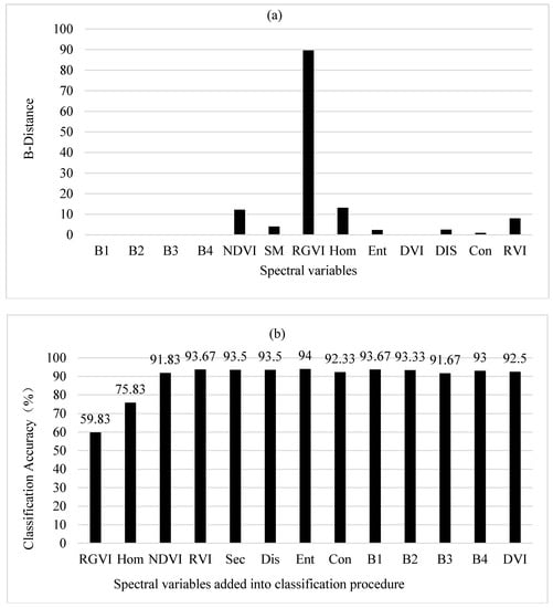 Based on B-distances, the largest value of class separability was achieved by RGVI, then Hom, NDVI, RVI, SM, Dis, Ent, Con, B1, B2, B3, B4 and DVI (Figure 6a). It had to be pointed out that in Figure 6a, the values of B1, B2, B3, B4 and DVI were 0.04, 0.03, 0.01, 0.01 and 0.01, respectively and could not be shown because of being too small. The importance rank of the spectral variables was greatly different from those obtained using the original JM distances and divergences. When the first two spectral variables RGVI and Hom were added, the overall classification accuracies of 59.8% and 75.8% were obtained using BD classifier (Figure 6b). Adding the third spectral variable NDVI led to a great increase of the overall accuracy up to 91.8%. After that, the classification accuracy slightly increased and fluctuated as more spectral variables were introduced. The greatest overall accuracy of 94.0% was yielded when the first seven spectral variables (RGVI, Hom, NDVI, RVI, SM, Dis and Ent) were used. Overall, the statistically stable classification accuracies were found when the number of the selected spectral variables was equal to and greater than 3.