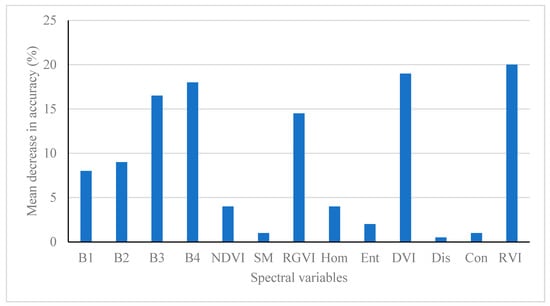 The importance of spectral variables quantified using mean decrease in classification accuracy by random forests (RF).