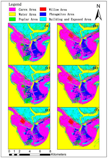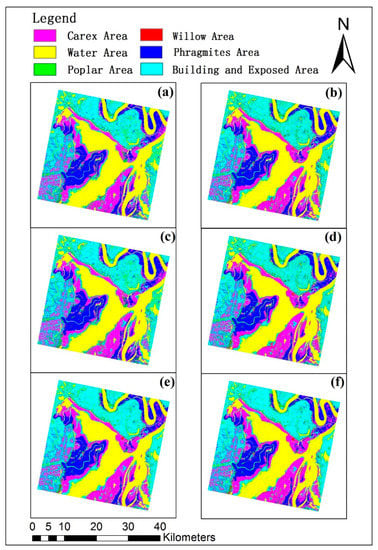 The comparison of land cover type classification maps using six methods to select the first four spectral variables: (a) JM distances; (b) correlation-weighted JM distances; (c) Divergences; (d) correlation-weighted divergences; (e) B-distances and (f) correlation-weighted B-distances.
