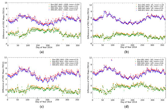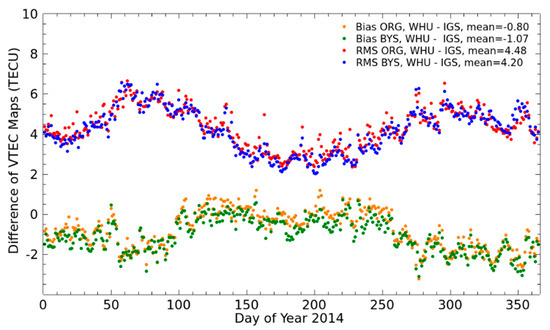 - Wang, C.; Shi, C.; Zhang, H.; Fan, L. Improvement of global ionospheric vtec maps using the iri 2012 ionospheric empirical model. J. Atmos. Sol. Terr. Phys. 2016, 146, 186–193. [Google Scholar] [CrossRef]