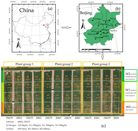 (a) Location of study area shown in red. (b) Map showing Changping District in Beijing City. (c) Design of treatments and an unmanned-aerial-vehicle image of the experimental field (acquired on 12 May 2015). Three plant groups are present with two winter wheat varieties (J9843 and ZM175), three water treatments (W0, W1, and W2), and four nitrogen treatments (N0, N1, N2, and N3).
