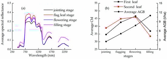 (a) Average hyperspectral reflectance spectrum for the four growing stages. (b) Average Chl and above-ground biomass (AGB) for the four growing stages.