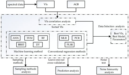 Data selection, sampling methods, noise immunity, and prediction performance were analyzed by using a series of VIs and ground-based measurements of the AGB. The flowchart in Figure 3 illustrates the process.