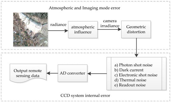 Many error sources exist in remote-sensing imaging and sensor systems (see Figure 4), including radiation errors caused by the atmosphere, topography, or other geometric errors and systematic errors related to the charge-coupled device (CCD) sensor [78,79]. Although radiometric calibration and radiometric correction are applied to correct for sensor degradation and atmospheric effects, the noise cannot be completely removed. Noise such as shot noise due to the quantum properties of light and readout noise generated by the output amplifier remain, and both follow a Poisson distribution [78]. In addition, the dark-current noise and thermal noise are present and are proportional to the CCD temperature; these follow a Gaussian distribution [78,79].