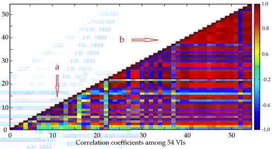 The correlation coefficients r among the 54 VIs are shown in Figure 5. For each VI, there are 53 colors that represent different correlation coefficient values. The results (Figure 5) show that complex correlations exist among these 54 VIs. NPQI (first), BGI (second), ARI (16th) and TCARI (22nd) are low correlated with other VIs. Among the top 22 VIs, a low correlation (zone a) was observed, but the remaining 32 VIs have a high correlation (zone b). The VIs analysis results of total explained variance and variance inflation factor (VIF) values are shown in Table A1 and Table A2 (in Appendix A).
