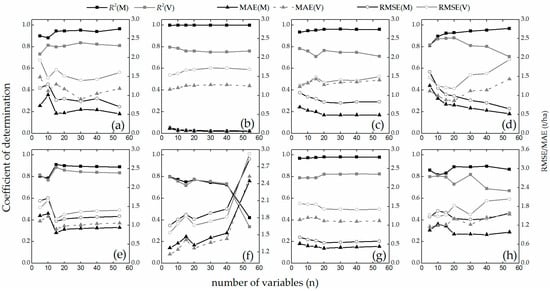 Best AGB modeling and validation accuracy for eight techniques with different input VIs: (a) ANN, (b) BBRT, (c) DT, (d) MLR, (e) PLSR, (f) PCR, (g) RF, (h) SVM. Note: R2 (M) and R2 (V) indicate R2 for modeling and validation, respectively. The same notation is used for MAE (M) and MAE (V), RMSE (M), and RMSE (V).