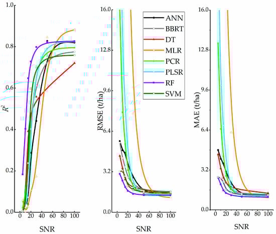 Figure 7 shows the noise immunity for the eight analytical techniques. The results indicate RF > SVM >DT > BBRT >ANN > PCR > PLSR > MLR. RF performs best in this test with a validation R2 near 0.2 and SNR = 5. For MLR, poor noise immunity was observed; its validation accuracy declined from SNR = 30 (Figure 7). Meanwhile, the validation of MLR (R2 (<0.2), RMSE (about 8 t/ha) and MAE (about 6 t/ha)) is the worst in eight techniques. As the noise increases (Figure 7, SNR <30), MLR, PCR and PLSR are extremely sensitive to it, whereas ANN, SVM, DT, and BBRT are more robust against noise; however, the latter techniques also show a poor performance with increased levels of noise (Figure 7, SNR = 5).