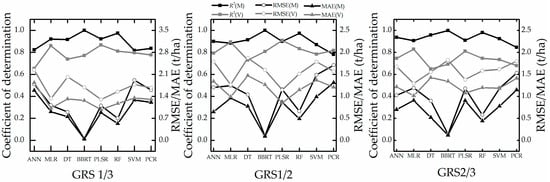 Figure 8 shows the results for modeling and validation using GRS1/3, GRS1/2, and GRS2/3 with the parameters given in Table 5. The calculated absolute difference of AGB − GRS modeling and the validation accuracy (we use ∇R2, ∇RMSE and ∇MAE to show the difference) are given in Table 6.