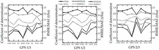 The modeling and validation results for GPS1/3, GPS1/2, and GPS2/3 are shown in Figure 9. The absolute difference of AGB − GRS between modeling and validation accuracy (we use ∇R2, ∇RMSE and ∇MAE to show the difference) appears in Table 7.