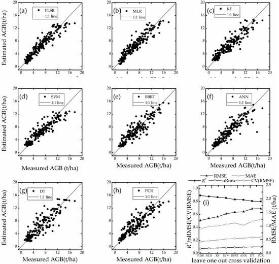 Measured and estimated AGB using leave one sampling. (a): PLSR; (b): MLR; (c): RF; (d): SVM; (e): BBRT; (f): ANN; (g): DT; (h): PCR; (i): R2, RMSE, MAE, NRMSE and CV(RMSE) of all techniques.