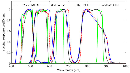 The PROSAIL model was then run to simulate the actual satellite observations of canopy reflectance based on the spectral response curves of ZY-3 MUX, GF-1 WFV, and HJ-1 CCD, which were acquired from CRESDA [55], and of Landsat-8 OLI, which was acquired from USGS [56] (Figure 2). The reflectance simulations of each band based on each satellite spectral response can be calculated from Equation (3) [16].