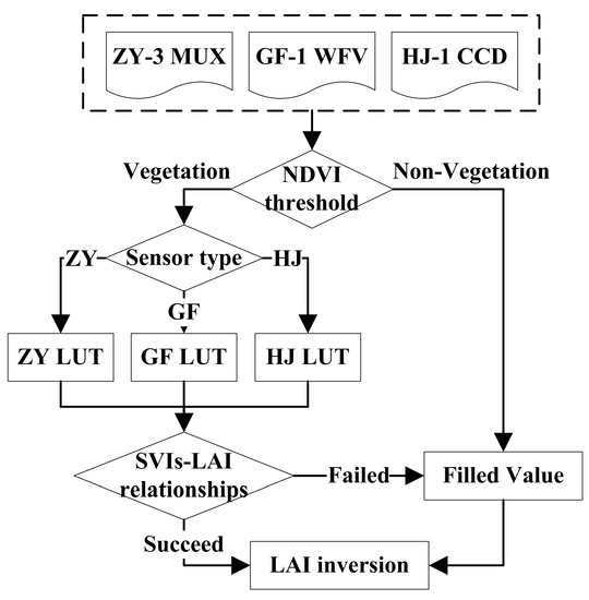 Flowchart of the LAI inversion method based on ZY-3 MUX, GF-1 WFV, and HJ-1 CCD.