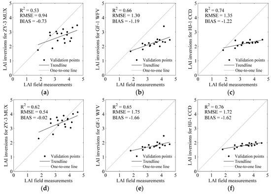 Comparisons of the LAI inversions with the field measurements for ZY-3 MUX (a,d), GF-1 WFV(b,e), and HJ-1 CCD (c,f).