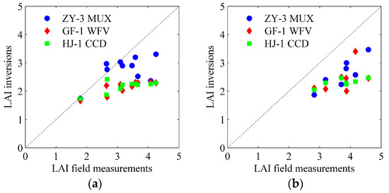 Validation of the LAI inversions from ZY-3 MUX, GF-1 WFV, and HJ-1 CCD using field data with high spatial representativeness (a) and low spatial representativeness (b).