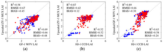 LAI inversions up-scaled to 16 m spatial resolution from ZY-3 MUX plotted against GF-1 WFV LAI inversions (a) and LAI inversions up-scaled to 30 m spatial resolution from ZY-3 MUX (b) or GF-1 WFV (c) plotted against HJ-1 CCD LAI inversions for pure (blue dots) and mixed (red dots) pixels.
