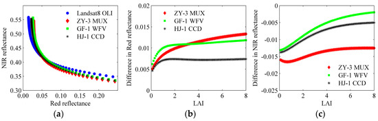 Reflectance in the red and NIR bands with LAI from 0 to 8 at 0.1 intervals for ZY-3 MUX, GF-1 WFV, HJ-1 CCD, and Landsat-8 OLI (a), and difference in reflectance in the red (b) and NIR (c) bands between Landsat-8 OLI and each of ZY-3 MUX, GF-1 WFV, and HJ-1 CCD for maize simulations.