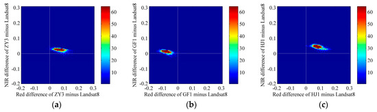 Density scatter plots of the reflectance difference in the red and NIR bands between Landsat-8 OLI and each of ZY-3 MUX (a), GF-1 WFV (b), and HJ-1 CCD (c) for croplands.