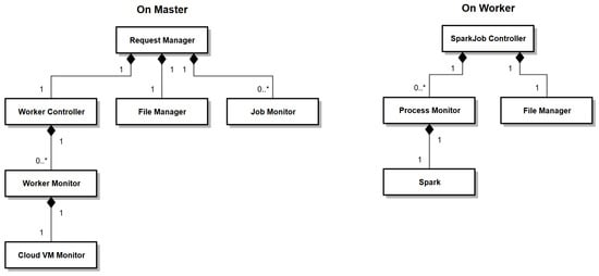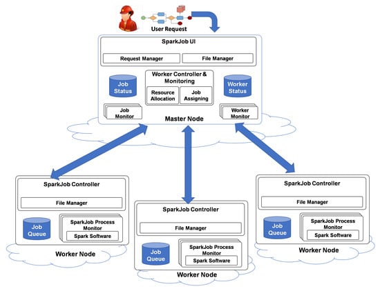 SparkJobController: The SparkJobController handles the following: receiving job submissions, managing job files (input/configuration and output files)—through the File Manager—queueing jobs, coordinating job execution, and notifying the “Worker Monitor” (on the master) of changes in the workers’ status.