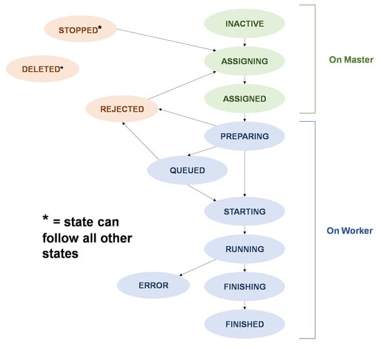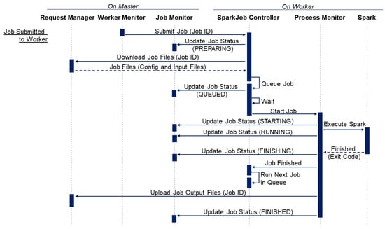 Figure 5 highlights the sequence of actions performed on a worker node as it receives a new job submission (as a job ID string) from the master (from its respective Worker Monitor on the master). When a job ID is received, the worker (SparkJob Controller) will confirm that it has accepted the job by sending a request to the master (to its respective Job Monitor) to update the job’s status to PREPARING (
