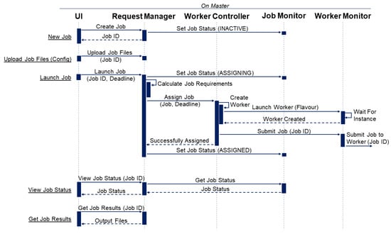 Figure 4 illustrates the basic interactions between the client and the master. When the user makes a request, it is forwarded to the Request Manager, which coordinates all the core services on the master (namely, the Worker Controller and Job Monitors). For example, when a user requests to launch a job, the UI will send the job’s ID string with the user’s desired deadline to the Request Manager. To start the process, the Request Manager will update the job’s status to ASSIGNING through the Job Monitor. The Job Monitor contains all state-related information for a job and ensures that the job successfully completes each stage of execution (see