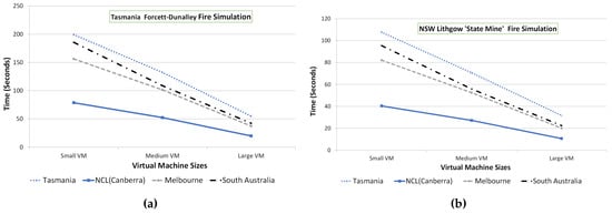 Figure 7 shows how the simulation time varies with the different type of VMs and different locations. The presented results are the average of five repeated experiments. It is clear that Spark scales linearly with the increasing number of virtual cores (i.e., the size of VMs) for both the case studies. There are differences in the execution time of different case studies, which is due to different simulation parameters. It is interesting to observe that different datacenters have a dramatic effect on benchmarking results, which highlights that the underlying physical machines across different locations of Nectar Cloud are quite different. The “NCI (National Computational Infrastructure) Canberra” region has the fastest hardware, and thus the jobs with a tighter deadline can be scheduled to this datacenter.