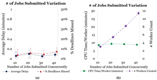 Figure 8 shows the results of the first scenario, where the number of simultaneous user requests were varied. As the number of user requests (jobs submitted) increased, the CPU time per worker remained constant—which is ideal for load balancing—and the number of workers created increased linearly—which is also ideal.
