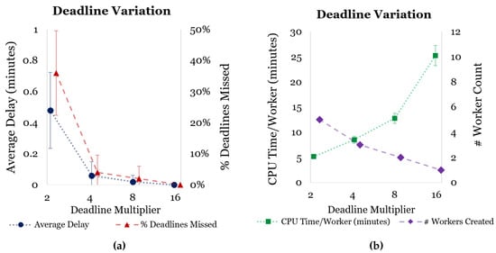The rate of deadlines missed depends on how well the jobs can be divided into workers. This is highlighted by the perfect 0% deadlines missed during the 16 deadline multiplier experiments. The deadlines missed and average delay results for the 4 and 8 deadline multiplier experiments included 0 in their respective confidence intervals; thus more evaluation is required to confirm any relationship between the higher deadline multiplier (4, 8, 16, etc.) and delay/deadlines missed.