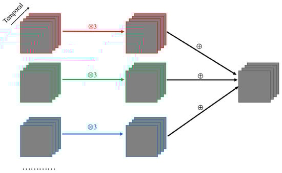 To prevent a 2D convolution operation collapsing, all of the information from separate channels to a 2D plane (see Figure 1a), a 3D convolution as in Equation (3) can be used to extract and reserve the dynamic features through consecutive periods (see Figure 1b), and can be written as,