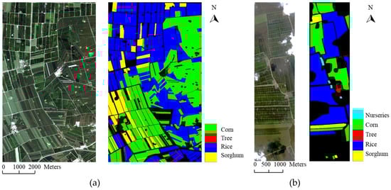 We use two GF2 (Gaofen 2) multi-temporal images (Figure 5), acquired, respectively, in June, July, August, and September of 2015, and May, June, July, September, and October of 2016, and a GF1 (Gaofen1) image (Figure 6), acquired in April, May, July, and September of 2014, for testing. The GF1 satellite was launched in 2013 and the GF2 in 2014, both of them are in series of Chinese high-resolution earth observation system. The GF2 images have four bands, red, green, blue and near infrared, with image size of 1417 × 2652 and 1111 × 293 pixels and 4 m ground resolution. The GF1 image contains 5400 × 6500 pixels with 15 m ground resolution. Both of GF1 and GF2 data have been preprocessed with quick atmospheric correction (QUAC) method [] and geometrical rectification.