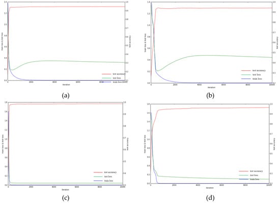From Table 2, kernel size of 3 × 3 × 3 shows slightly better than other kernel sizes of 1 × 3 × 3 and 3 × 5 × 5. It is compatible with the results in video recognition [], and indicate 3 × 3 × 3 maybe a robust setting to generic spatio-temporal representation. Patch size 8 × 8 (w × h) is the most suitable to both GF1 and GF2 data for larger patch size may cause mixed-pixel problem. For the number of the convolutional layer (short as “3 L” for example), three convolutional layers perform slightly better than two-layer and four-layer networks. Four or more layers are not necessary here for after three 2× pooling the sample size has been reduced to 1 in image space. For pooling strategy, “A” and “M” denote average pooling and max pooling respectively. The average pooling got 1.3, 1.6, and 2.0 percent better performance than the max pooling in GF2 2015, GF2 2016, and GF1 data, respectively. The training process with the optimal parameters, i.e., the last-column ones, is shown in Figure 7. The training converged fast after several hundred iterations, and the test accuracy is gradually and slightly improved in the following thousands of loops.