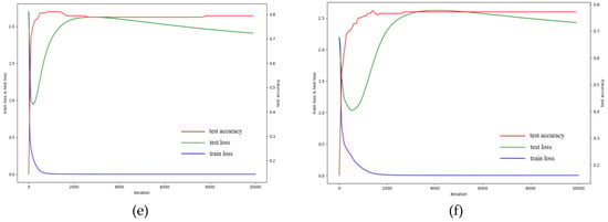 Test accuracy (red line), training loss (blue line), and test loss (green line) with optimal parameters. The test accuracy of 3D CNN shows 0.7%, 1.7% and 2.2% higher than that of 2D CNN in GF2-2015, GF2-2016 and GF1 data, respectively. (a) 3D CNN for GF2 2015 data; (b) 2D CNN for GF2 2015 data; (c) 3D CNN for GF2 2016 data; (d) 2D CNN for GF2 2016 data; (e) 3D CNN for GF1 data; and, (f) 2D CNN for GF1 data.