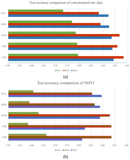 Comparison of test accuracy among 2D CNN, 3D CNN, SVM, KNN, and PCA with NDVI and original data respectively. (a) Concatenated temporal image patches as input; (b) Concatenated NDVI maps of different periods as input.