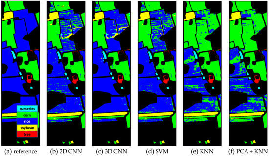 Pixelwise classification results of different methods on GF2 2016 data. (a) reference; (b) 2D CNN; (c) 3D CNN; (d) SVM; (e) KNN; and, (f) PCA + KNN.