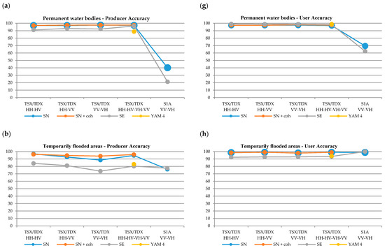 Referring to Table 1, some vegetation types (common reed, reed canary, sweet grass) possessed quite similar features regarding the microwave scattering mechanisms, for example, broad leaves and thin stems. For this reason, the set of thematic classes from Table 1 turned out to be too detailed to be distinguished by classification of the multi-temporal SAR images collected in this experiment. In fact, the classification based on initial samples only achieved a low accuracy level (OAA < 40%). It was then necessary to reduce the number of classes. For both the S1A and TSX/TDX datasets and an OAA exceeding of 40%, it was possible to distinguish six thematic categories: (1) permanent water bodies, (2) temporarily flooded areas, (3) wet grasslands, (4) dry grasslands, (5) common reed, and (6) deciduous forest. The number of classes, which is sensibly smaller than expected at the beginning of the experiment, was fixed for all datasets submitted for classification (see Table 4). For these six classes the temporal signatures representing sigma nought at different polarizations (see Figure 9a–d) and coherence values (mean and standard deviations) extracted from the TSX/TDX multi-temporal dataset are presented in the Figure 9e–h.