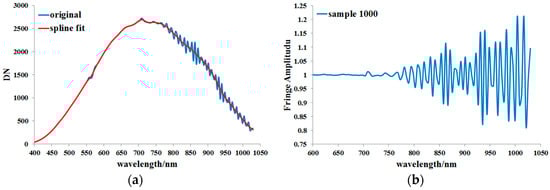 The acquired calibration data (150 bands by 2048 samples) from Camera 1 is shown in Figure 2. There are obvious interference fringes in the NIR bands. In addition to the interference fringes, there are vertical stripes (fixed-pattern non-uniformity) distributed along the spatial dimension. The fringe-free data is obtained through a spline fit of the calibration data in spectral dimension; then, the fringe amplitude of each pixel is obtained when the fringe data is divided by the fringe-free data. The DN (Digital Number) response curve along sample 1000 and its spline fit result are shown in Figure 3a. The fringe amplitude along sample 1000 is presented in Figure 3b, where the spectral fringes become serious for wavelength longer than 760 nm. Figure 4 shows the fringe amplitude image of the calibration data. The interference pattern is a combination of both spectral and spatial contributions, and does not show any obvious regularity.