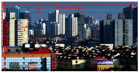 The collected ground data from Camera 1 is shown in Figure 5. It consists of 4000 scanning lines with 2048 spatial samples per frame in the cross track direction. Two sub-images in visible bands are shown in Figure 6a,c, and two sub-images of the same region in NIR bands are shown in Figure 6b,d. In Figure 6a,c, the horizontal stripes are caused by the fixed-pattern non-uniformity. While in Figure 6b,d, in addition to the stripes caused by fixed-pattern non-uniformity, there are rainbow-like stripes, which are the results of interference, and they become obvious in Figure 6d. The collected ground data from Camera 2 is shown in Figure 7. It consists of 2200 scanning lines with 2048 spatial samples per frame in the cross track direction. In Figure 7a, no interference fringes are presented, while they are quite obvious in Figure 7b. Compared with Camera 1, Camera 2 suffers much more serious interference fringes in NIR bands due to its higher spectral resolution. A good thing for Camera 2 is that it suffers little from the fixed-pattern non-uniformity problem. The spectral response curves of the four typical targets marked in Figure 5 are shown in Figure 8a, and the spectral response curves of two typical targets acquired by Camera 2 are shown in Figure 8b. As illustrated in the red box, all the spectra suffer from serious spectral fringes for wavelength longer than 760 nm, especially for those acquired by Camera 2, since a higher spectral resolution will result in more serious interference.