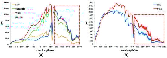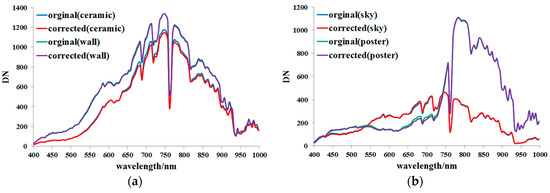 Comparison between the original spectra and the spectra corrected using the proposed method. (a) Ceramic and wall; (b) sky and poster.