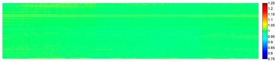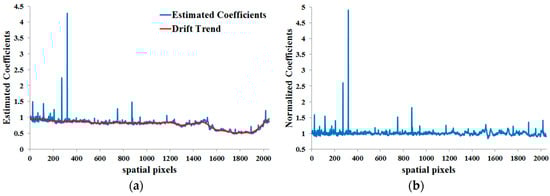For the ground data, Step 1 is performed from band 86 (). Then, the spatial correction coefficients are solved for each band, which will suffer from the increasing “drift” problem as we move further from the original sample. To estimate the drift trend, a Fourier interpolation method is used, of which the difficult part is to determine the number of low frequency components used for Fourier interpolation. In our case, there are 2048 spatial correction coefficients (N = 2048) for each band, and they are divided into 128 groups with each 16 consecutive coefficients per group. After discrete Fourier transformation is performed to the vector consisted of the median values of the 128 groups, there will be 128 frequency components, and 10 low frequency components (n = 10) are used for Fourier interpolation. Finally, the normalized spatial correction coefficients can be obtained by eliminating the drift trend from the estimated spatial correction coefficients. Figure 14a shows the estimated coefficients of band 60 and the corresponding drift trend, and Figure 14b shows the normalized spatial correction coefficients. As the two figures show, the estimation of the drift trend is reasonable.