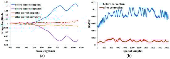 (a) The peak and valley fringe amplitudes before and after correction; (b) RMSE is calculated for each column of the fringe amplitude image before and after correction.