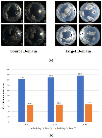(a) Cloud examples from two different domains. In the source domain, the lower right image: the sun seems to be on the right, while in the target domain image, the sun seems to be on the left; (b) When these samples are trained in the source domain (S) and tested in the target domain (T), the classification accuracies of three representative methods, i.e., LBP, LTP and CLBP, decrease rapidly.