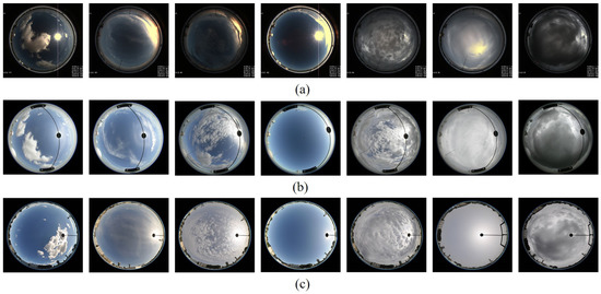 The second cloud database is the IAP database, which is provided by Institute of Atmospheric Physics, Chinese Academy of Sciences. The database is also divided into seven classes. The sample number of each class is different and the total number is 1518 as listed in Table 1. The cloud images in this database are captured in the same location as the CAMS database, but the acquisition device is different from that of the CAMS database. The cloud images from the IAP database have pixels, a strong illumination and occlusion. Note that the occlusion in cloud images is caused by a part of the camera. Samples for each class are shown in Figure 7b.