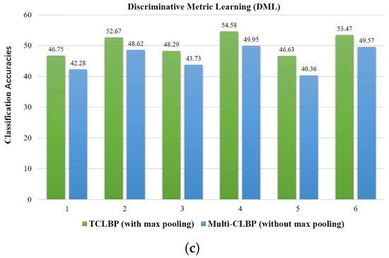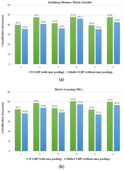 The cross-domain ground-based cloud classification is largely affected by changes in image resolution, illumination and occlusion, which should be addressed in feature representation and similarity measurement. The application of max pooling in TLF is an effective strategy to overcome changes in illumination, image resolution or occlusion. For fair comparison, we partitioned a cloud image into regions with different scales l = 1, 2, 3, and utilized a subwindow with the size of to densely sample the local patches with an overlap step of 5 pixels. We extracted CLBP feature in each patch, and then aggregated all features in each region using average pooling which preserved the average response of each histogram bin among all histograms. Each cloud image was also represented as a 2268-dimensional feature vector. We defined the feature as multi-CLBP. By comparing the multi-CLBP without max pooling and TCLBP in different metrics, we found that this operation does improve the performance of cross-domain ground-based cloud classification, as illustrated in Figure 10. With max pooling, the classification results are improved by about 5% in all situations with different metrics.