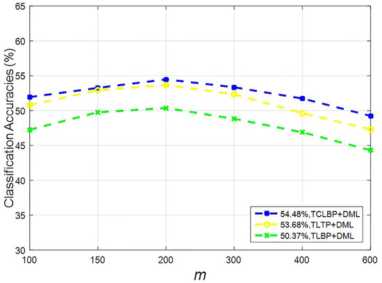 For the proposed DML, the dimensions of the projected space has an influence on performance. In other words, the parameter m in Equation (24) controls the dimension of W and as a result affects classification accuracies. This influence is shown in Figure 11, obtained by experiments on the IAP to MOC domain shift. Approximately, the performance is increasing with dimension increasing, but it decreases after 200 dimensions. The best experimental result is obtained with m equal to 200.