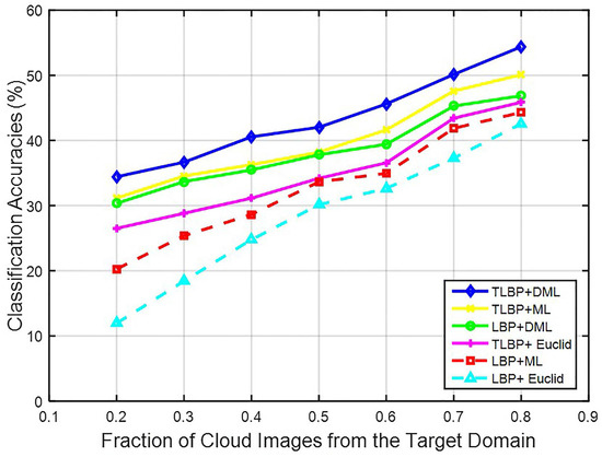 We varied the fraction of cloud images in each class from the target domain in increment of 20% up to 80%. The training images consisted of two parts, all cloud images from the source domain, and a fraction of cloud images from the target domain. We took the MOC to CAMS domain shift as an example. The average recognition accuracies for different fractions are shown in Figure 12. The classification capabilities of various methods reduce significantly when the number of cloud images from the target domain decreases. In contrast, our method outperforms other approaches with a tolerable accuracy due to adopting the stable feature representation and discriminative metric.
