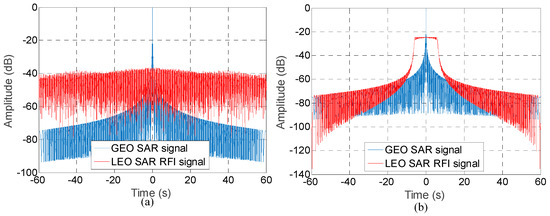 Specially, if our interesting target is point-like and isolated, the received pulses will have deterministic phases. In this case, Doppler filtering on RFI signal will have a good performance to weaken the RFI impact. Figure 6a shows the geometry difference between GEO SAR and LEO SAR. and are the velocity vectors of the LEO SAR system and the GEO SAR system, respectively. Vectors and represent the incidence direction (line of sight (LOS)) and the bistatic scattering direction, respectively. is the LOS angle between and . GEO SAR has a larger beam footprint (e.g., typically 400 km) than that of LEO SAR (e.g., typically 10 km in along-track). Moreover, the velocity of GEO SAR is small compared with that of a LEO SAR. Resultantly, the Doppler rate of GEO SAR is very small compared with that of a LEO SAR. To achieve the same azimuth resolution, the Doppler bandwidth of GEO SAR is much smaller (only dozens of Hz at most) than the Doppler bandwidth of a LEO SAR (hundreds to thousands Hz), which is shown in Figure 6b. Moreover, as the pulse repetition frequency (PRF) of GEO SAR is still smaller than the Doppler bandwidth of a LEO SAR, the Doppler frequency of a LEO SAR will be aliased. When doing the Doppler filtering in the imaging processing, a GEO system achieves the azimuth focusing by exploiting the small Doppler bandwidth. Therefore, the components of the LEO SAR RFI Doppler spectrum out of the Doppler bandwidth of GEO SAR could be filtered, as shown as the yellow regions in Figure 6b. It should be noticed that the aliased Doppler frequencies of the LEO SAR within the GEO SAR Doppler bandwidth cannot be filtered out.
